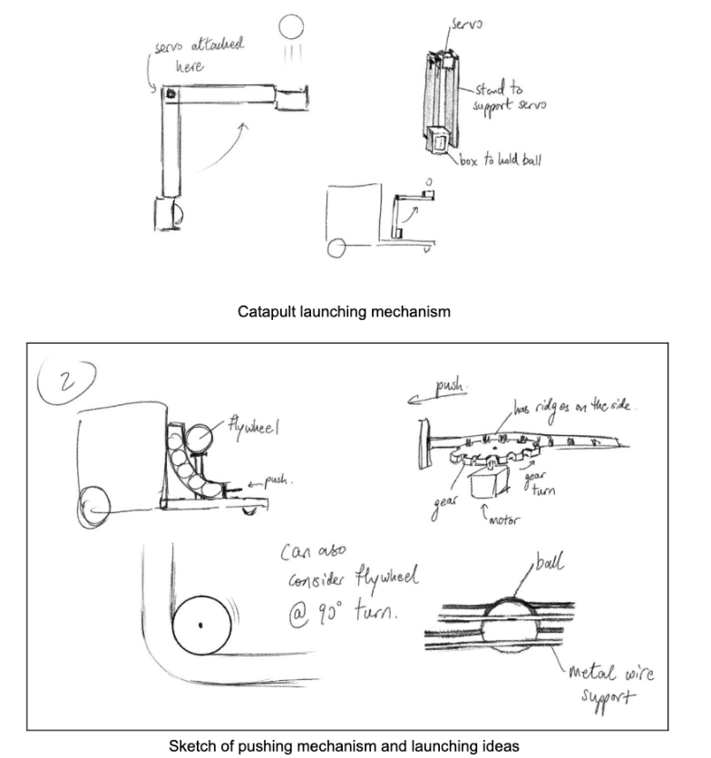 For the launching mechanism, there are many different options, namely using a spring, using rubber bands to form a trampoline-like structure, and using a catapult [3]. Additionally, we could also use a single or double flywheel launcher system [4]. The flywheel can be built using a chain or belt [5] or with compound gears [6]. If the motor spins fast enough, we can attach the flywheels to the motors directly.